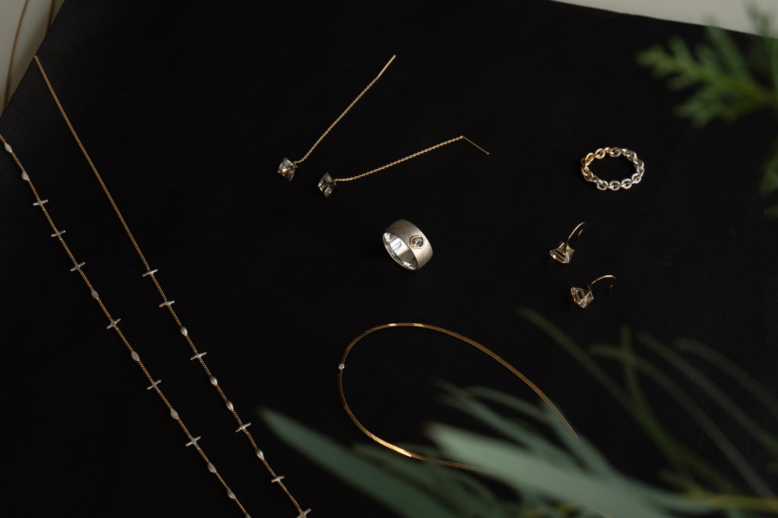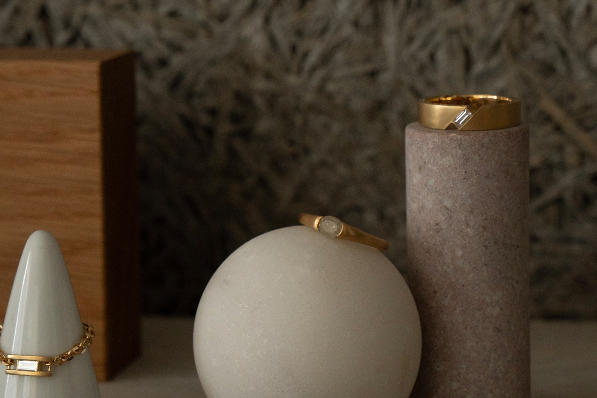 万物が静まり返る中に生まれる音や記憶、直感的に感じる物事が刻まれる背景に、そっと寄り添うジュエリー。
