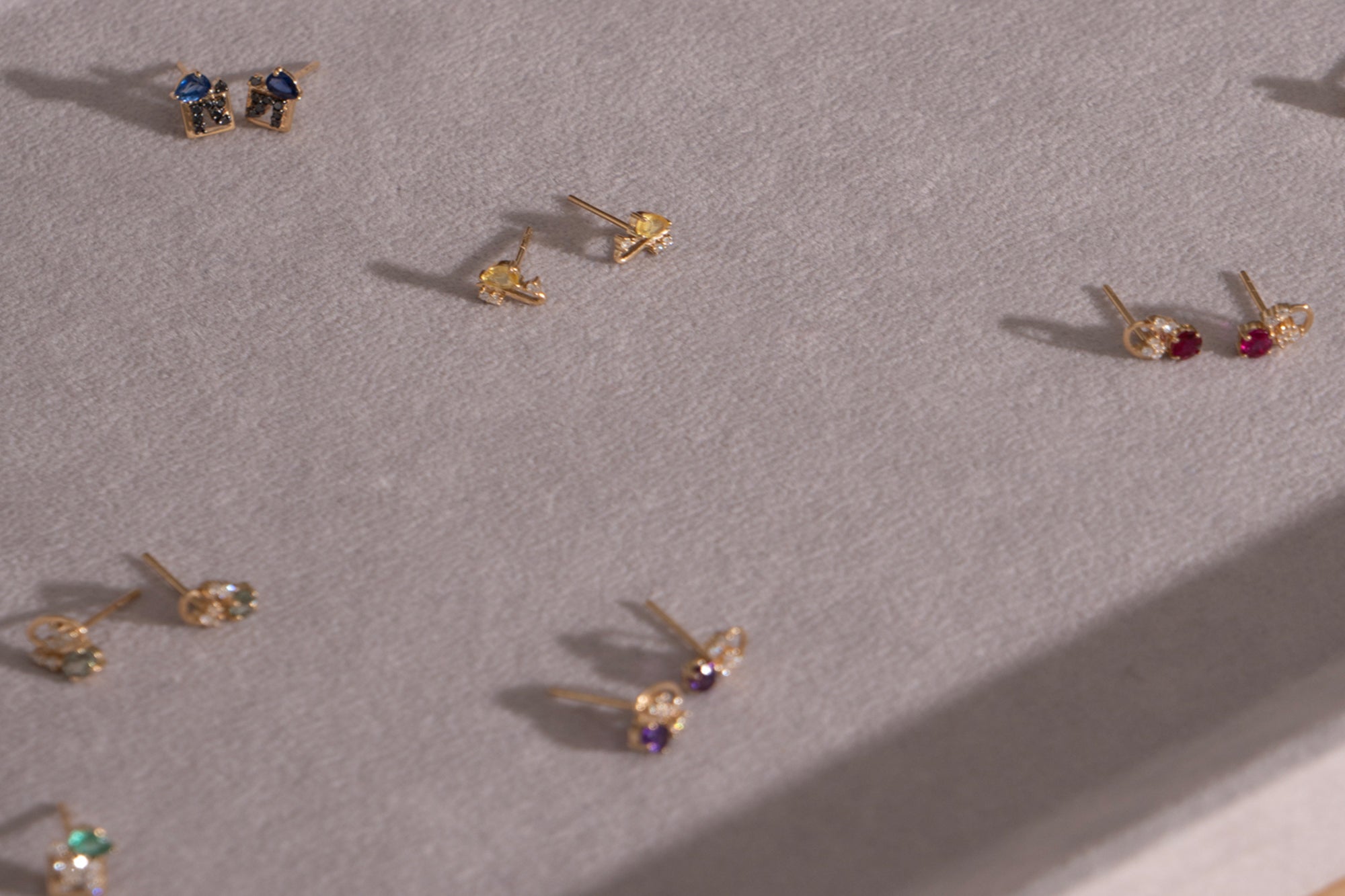 身に着ける向きが多様に選べるスタッドピアス。ストーンをサイドにセットしても、耳下にこぼれるようにアンダーにセットしても、正解は色々。自由にアレンジいただければと思います。