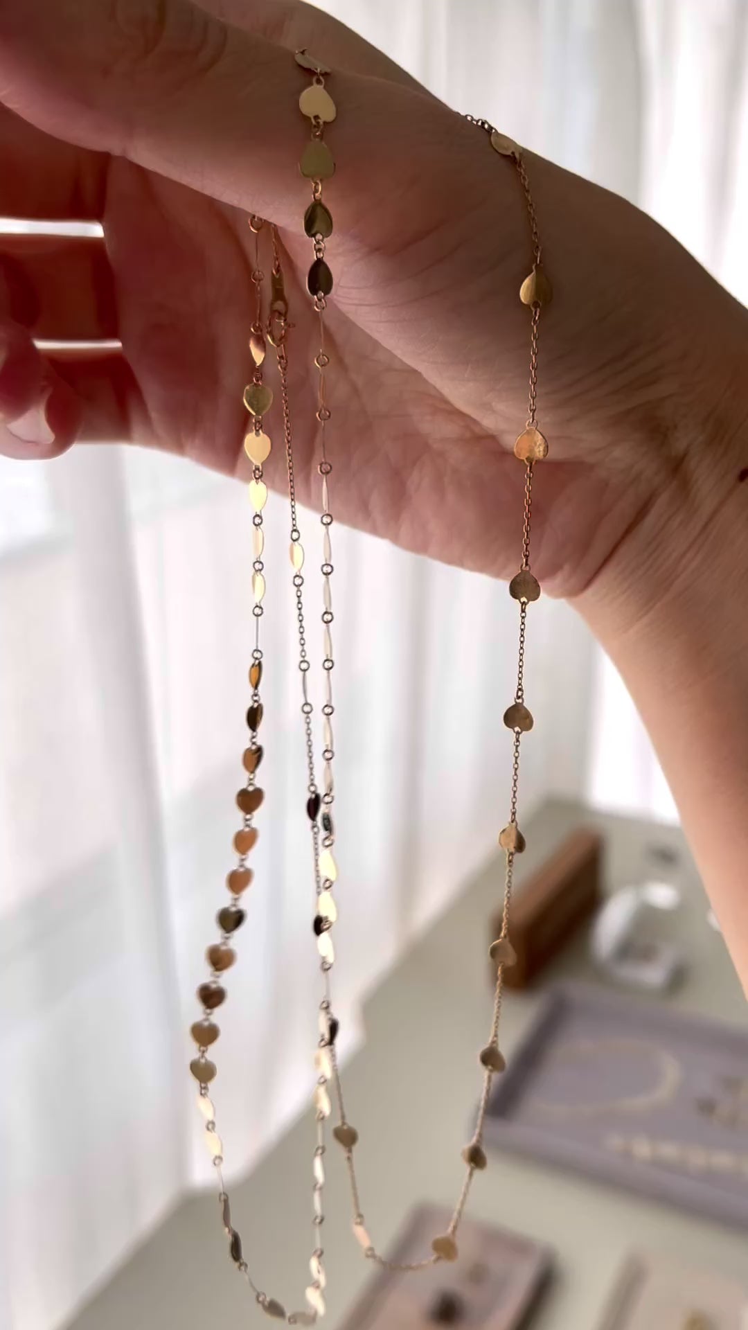 ハート♡型にプレスしたプレートを連ねたネックレス。
